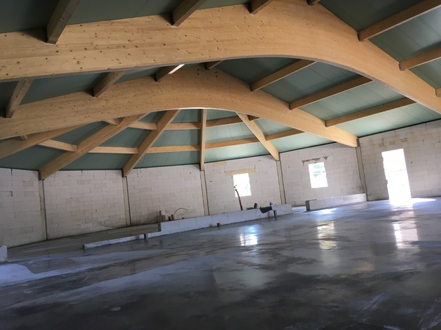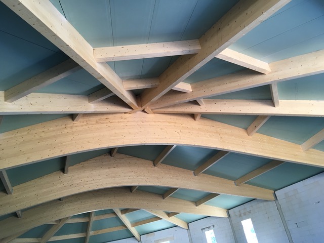 Charpente composée de poutres galbées reposant sur une maçonnerie auto stable et supportant un panneau sandwich et une couverture en tuiles. Architecte : Xavier Obry architecte