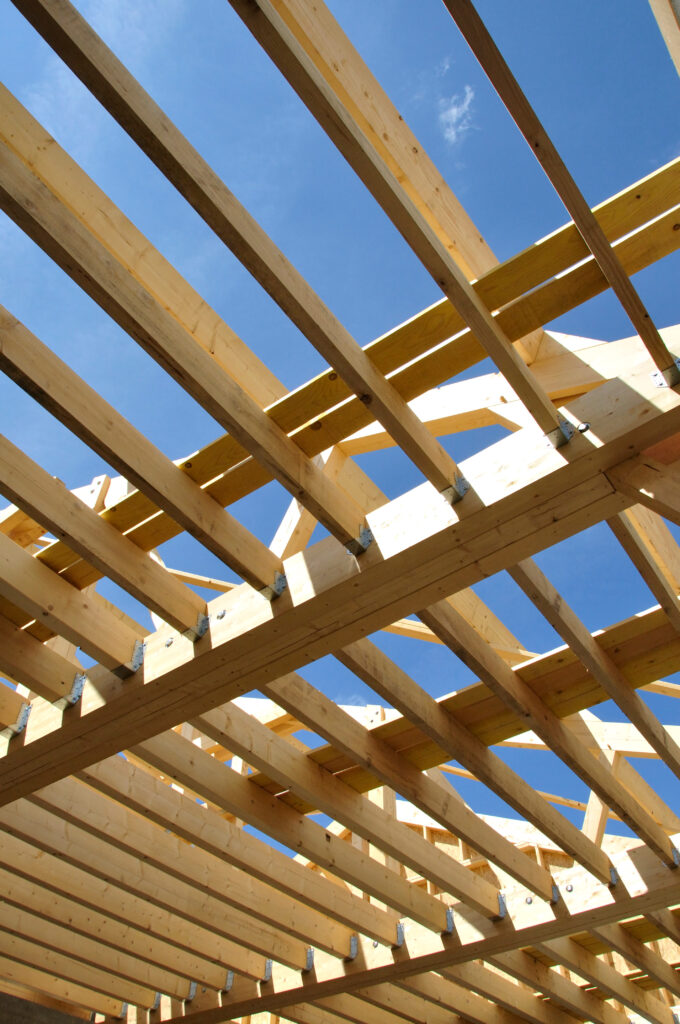 Dans les maisons à ossature bois, le bois lamellé collé est utilisé pour les charpentes, les poutres, les linteaux et les structures apparentes. Il permet de réaliser des éléments sur mesure, adaptés aux contraintes architecturales et aux performances thermiques recherchées.