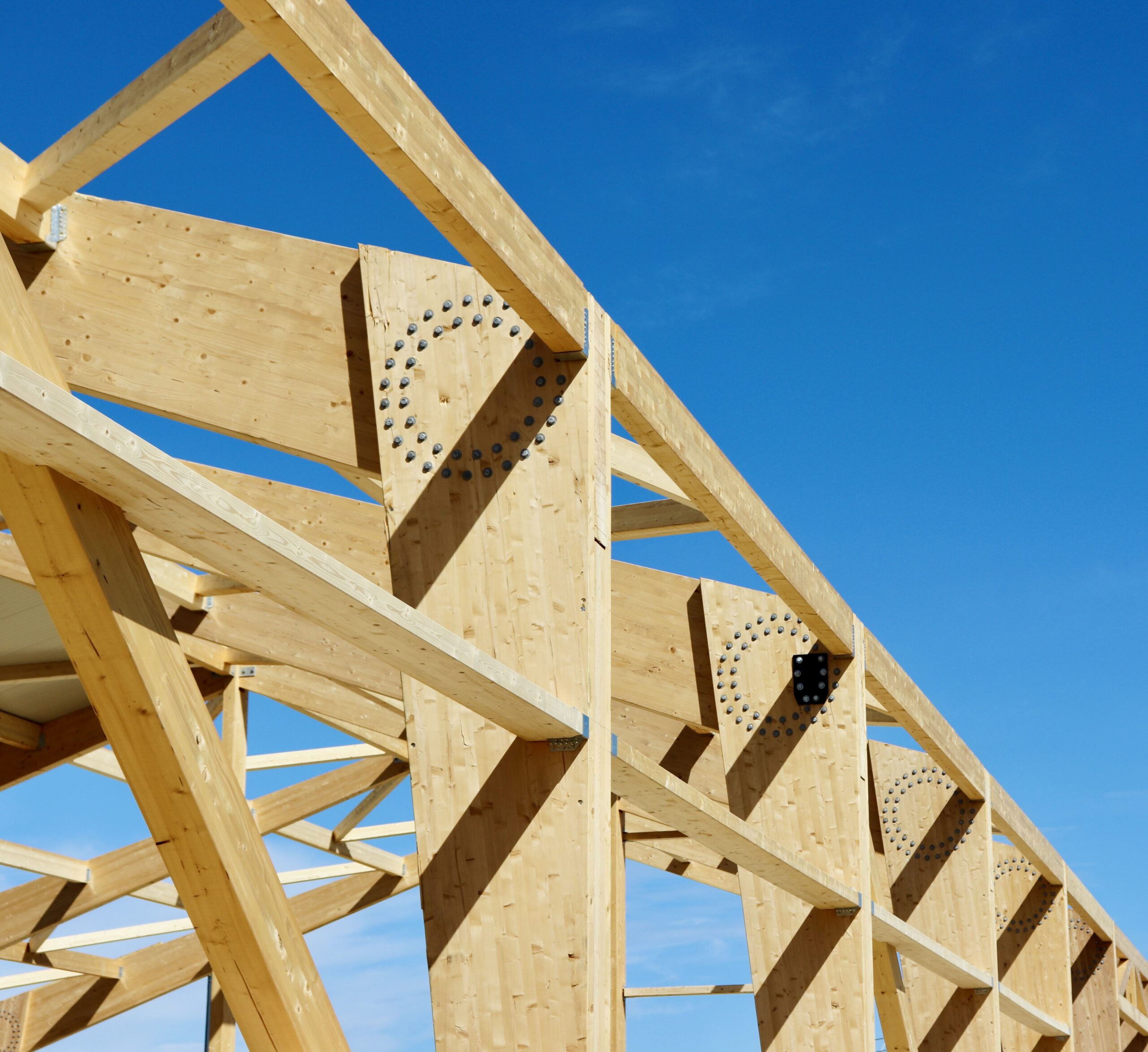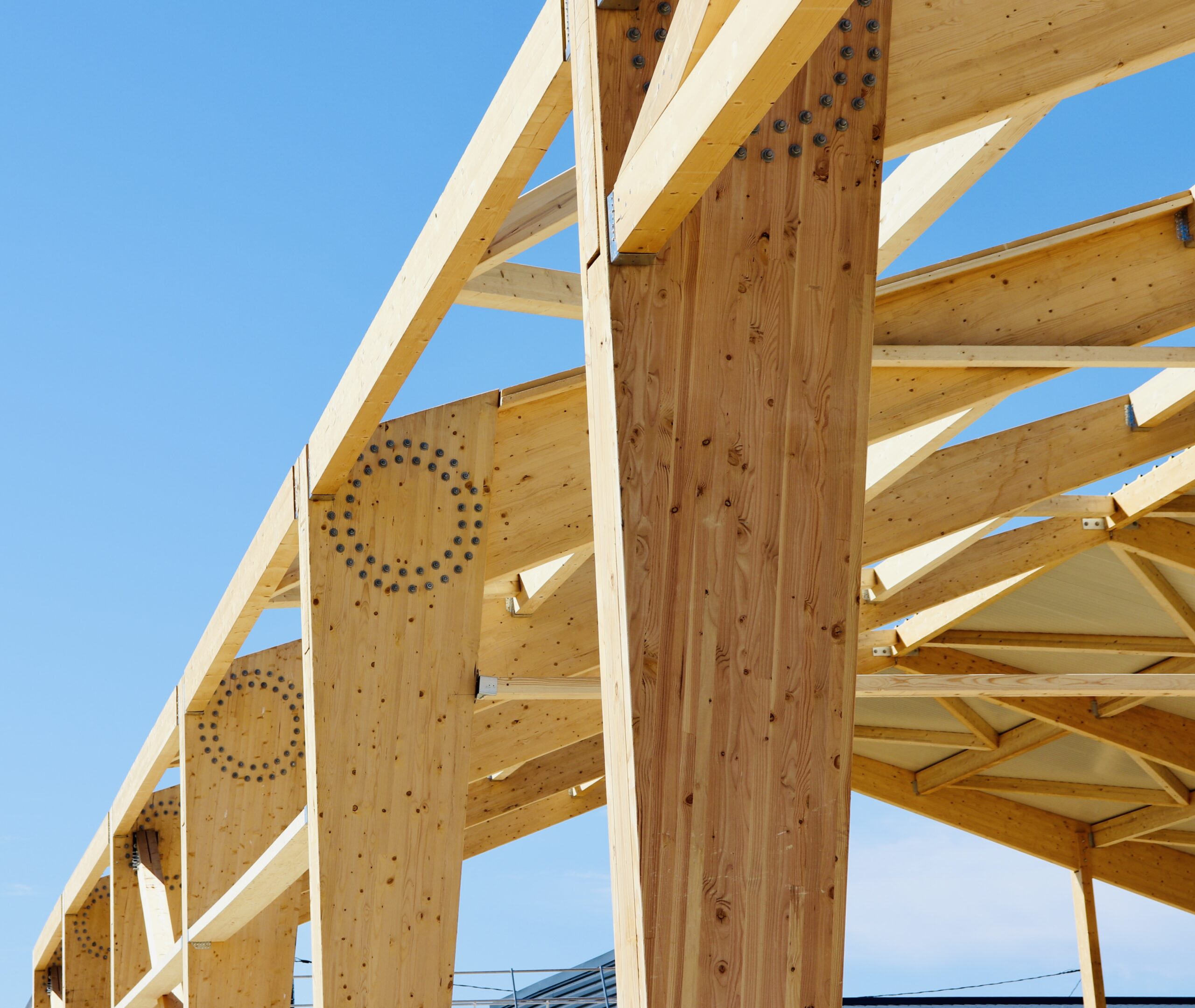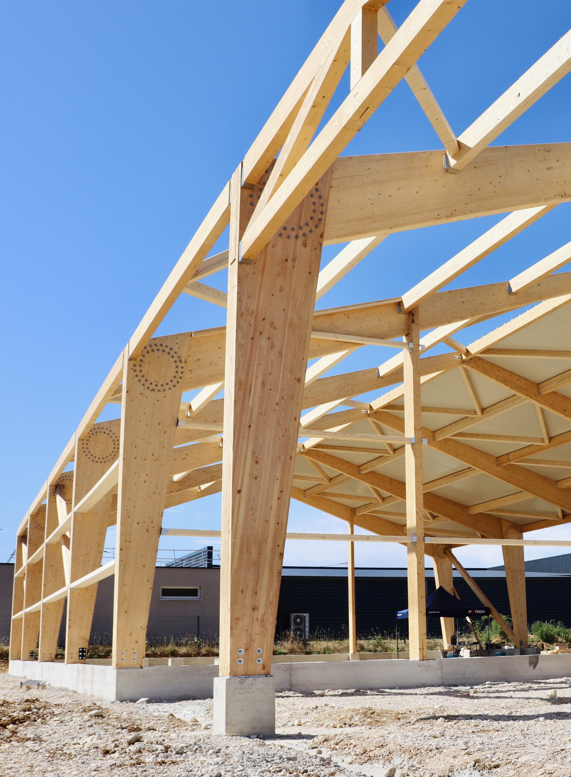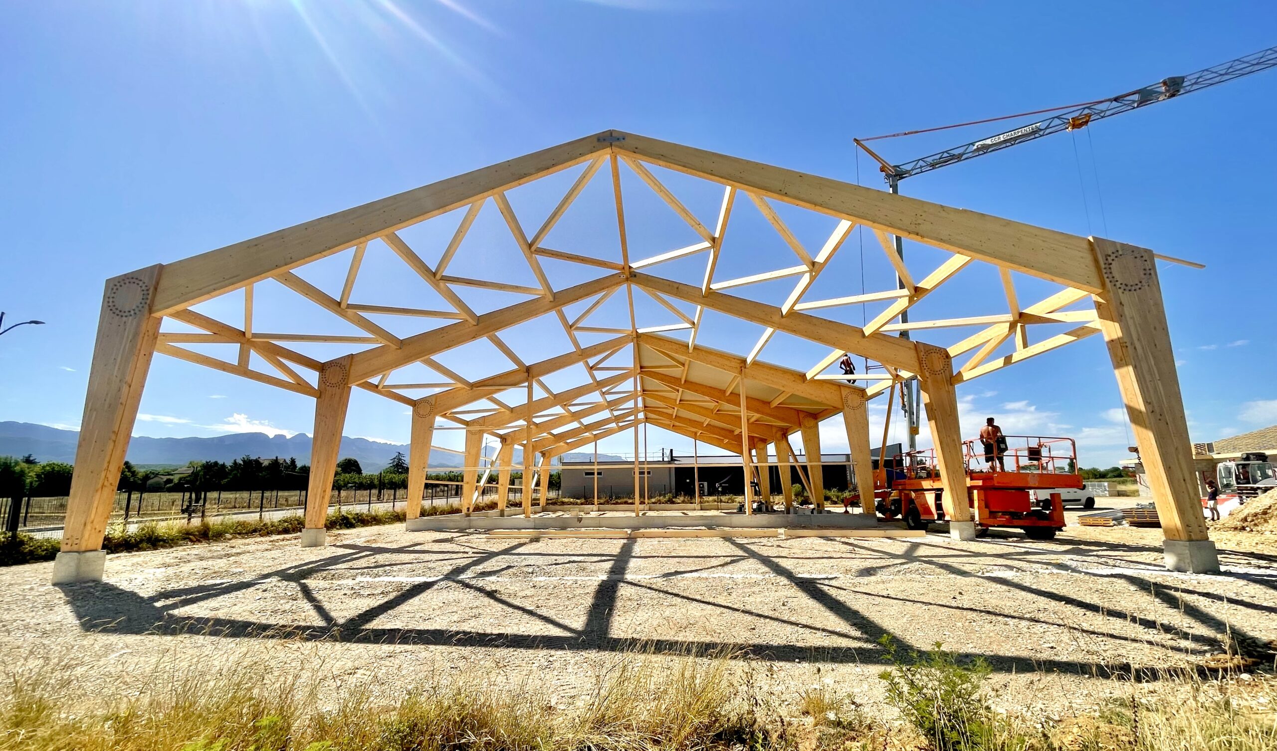 Réalisation d’un atelier de charpente ; structure composée de portiques avec couronnes de boulons, empannage et lisses recevant un bac acier simple peau