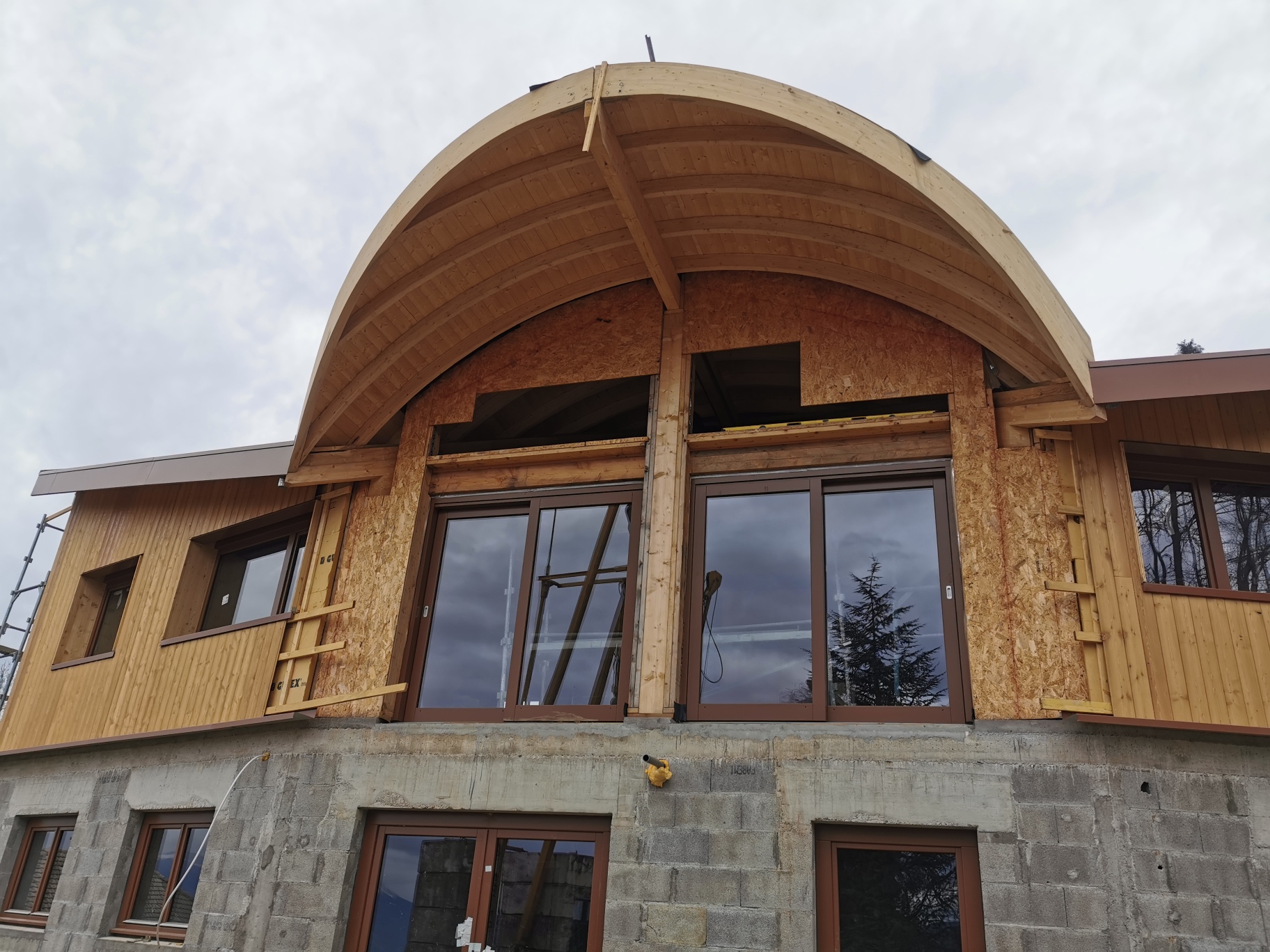 Maison à ossature bois et charpente à double pente coiffée d’une lucarne arrondie supportée par un bandeau porteur à double courbure.