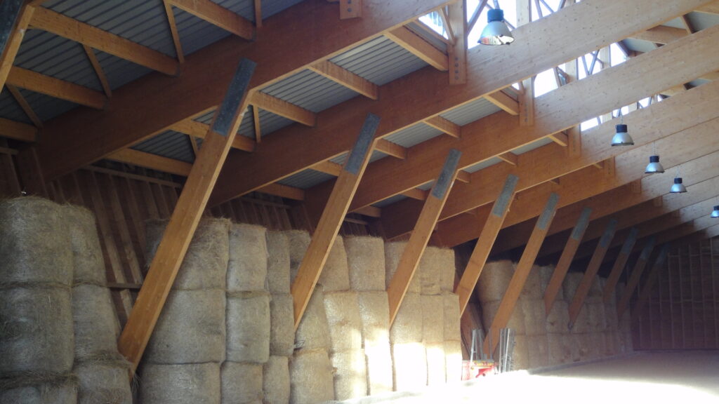 Structure bois triangulée de 25.00m de portée plus un appentis de 7.50m par 60.00m de long. Architecte : Pascal DURAND