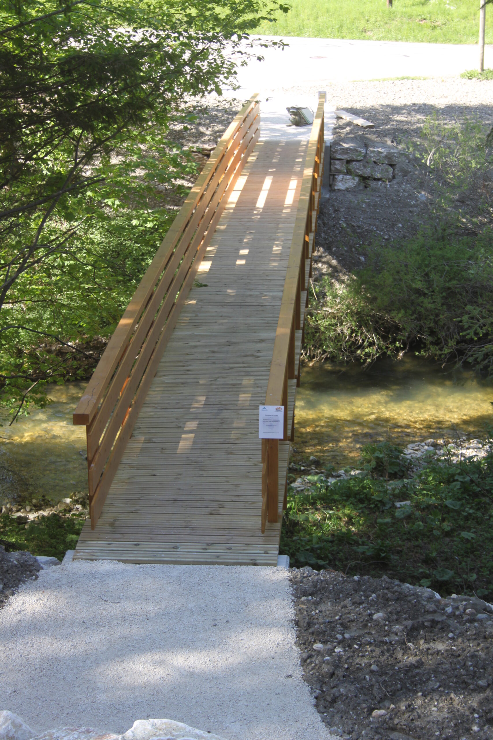 Structure composée de porteurs droits en BLC douglas classe 3 sous platelage bois et un garde – corps en bois fixé contre les poutres de rive. Platelage en bois classe 4.