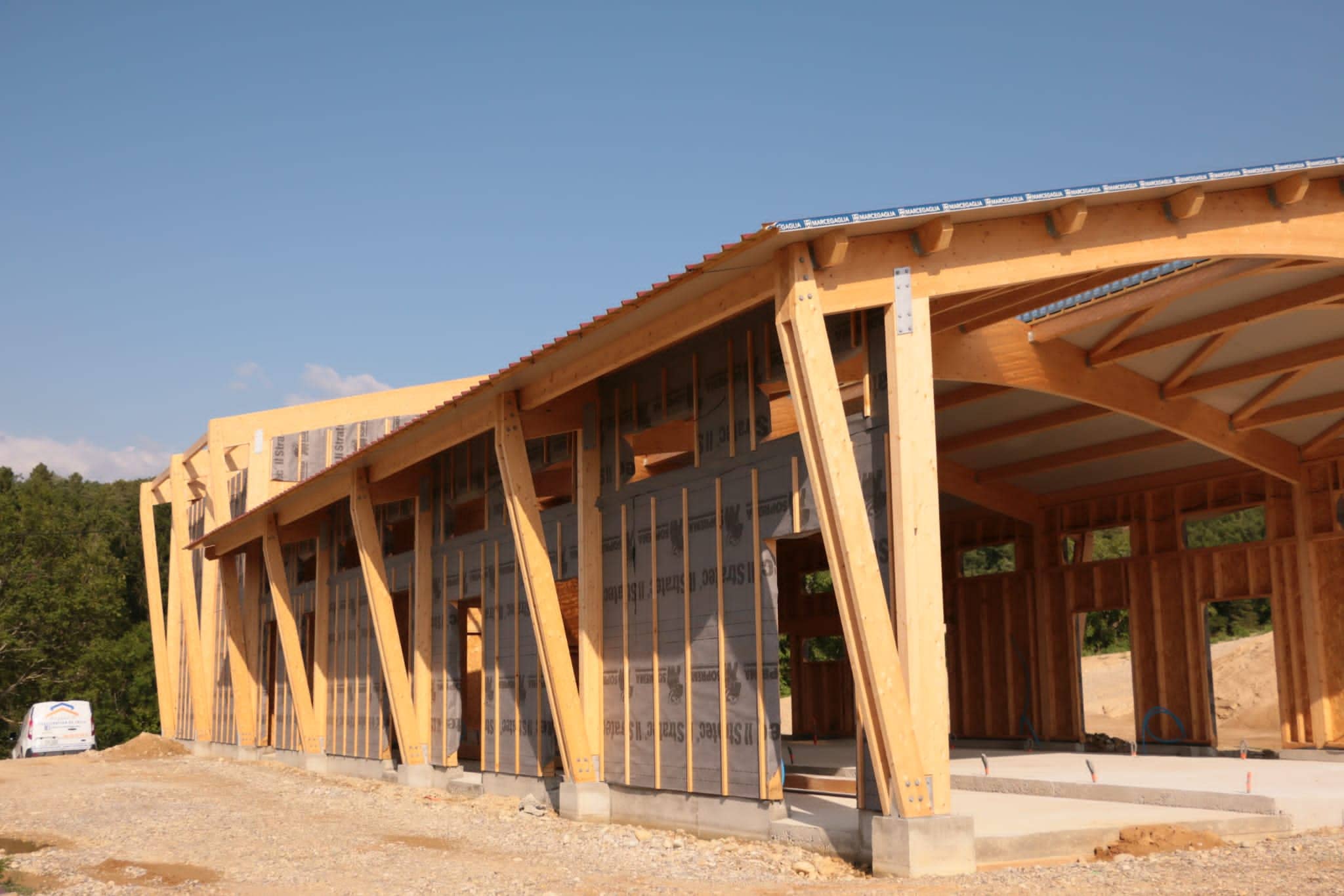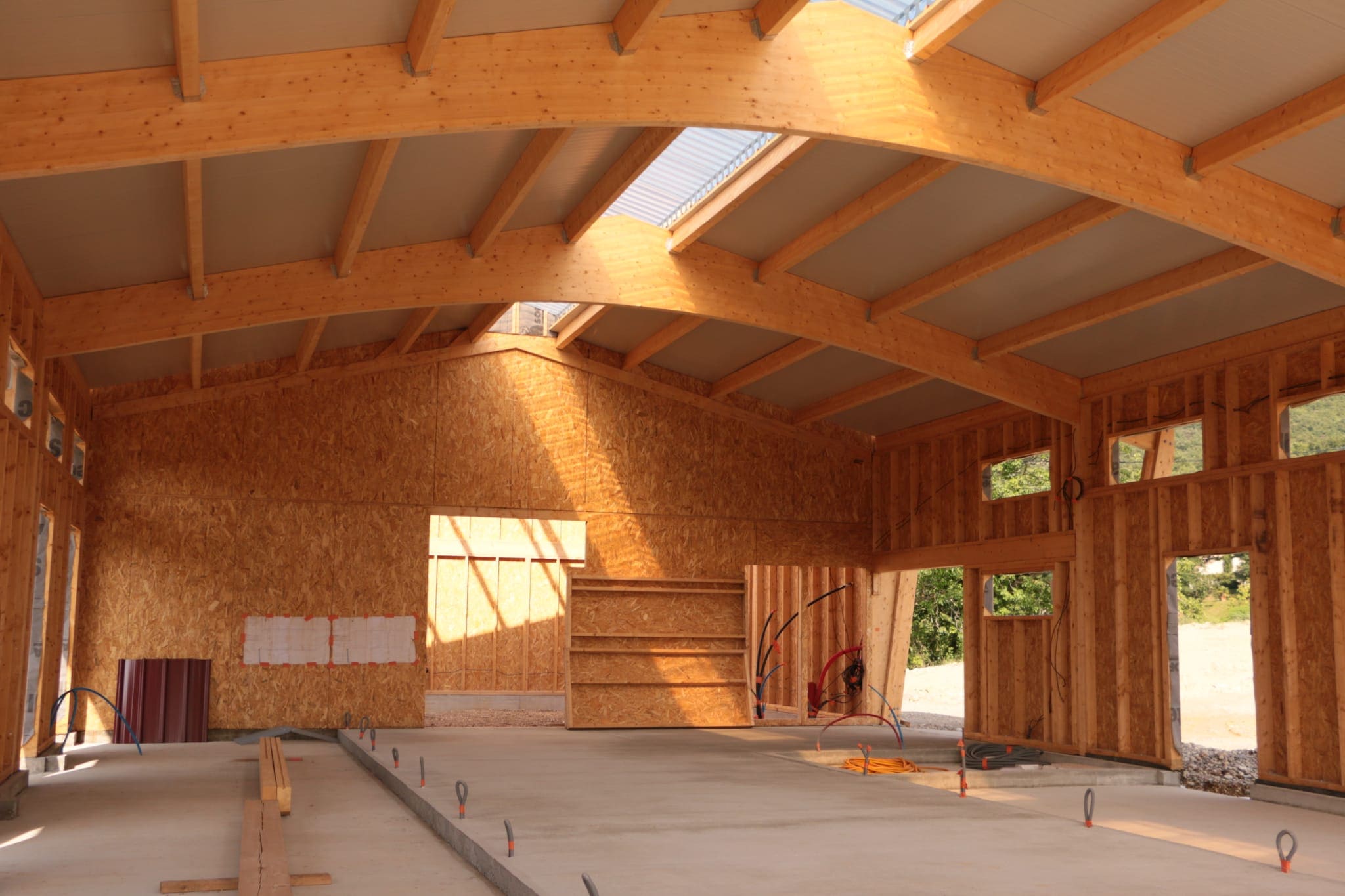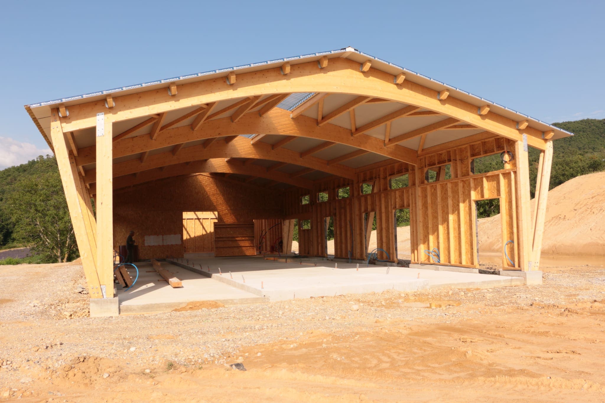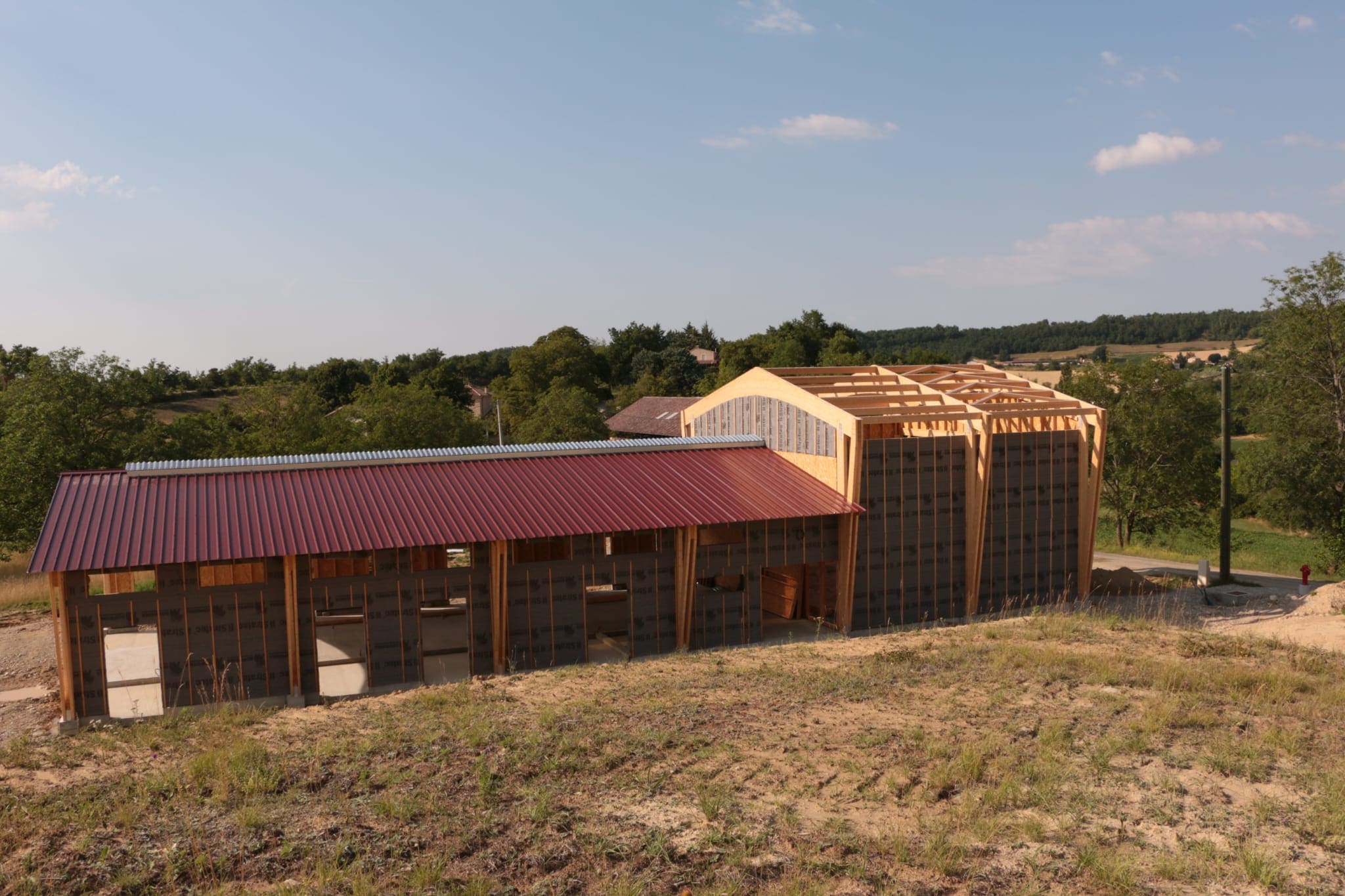 Construction d’une écurie et hangar de stockage à foin, structure composée de poutres galbées et poteaux triangulés et ossature bois support du bardage bois.