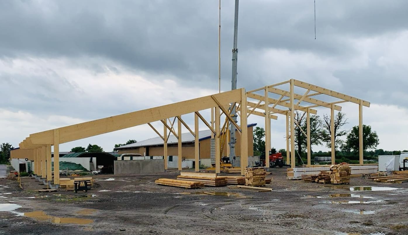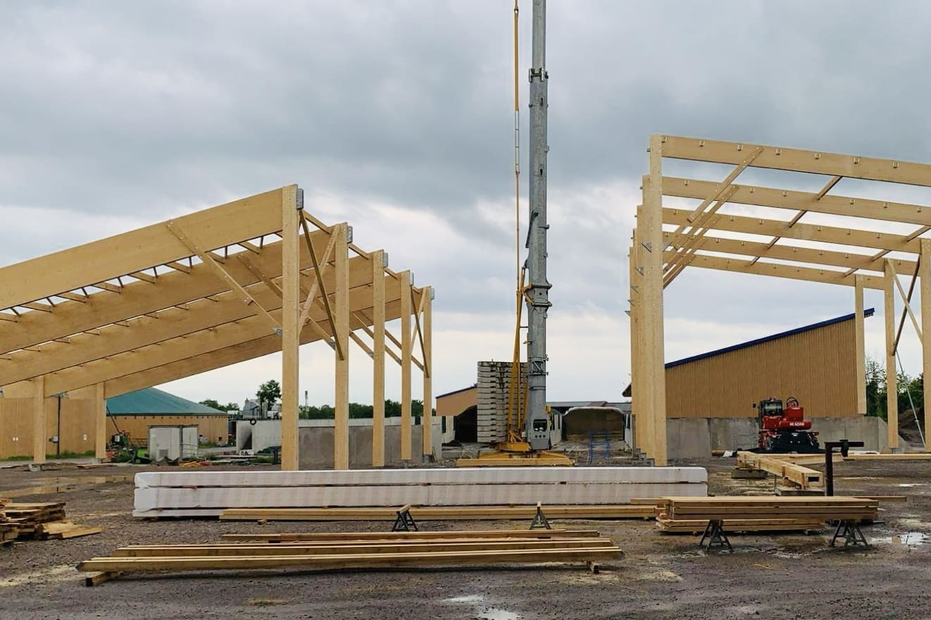 Hangar agricole, composé d’une structure 100% avec des portiques lamellé collé triangulés.