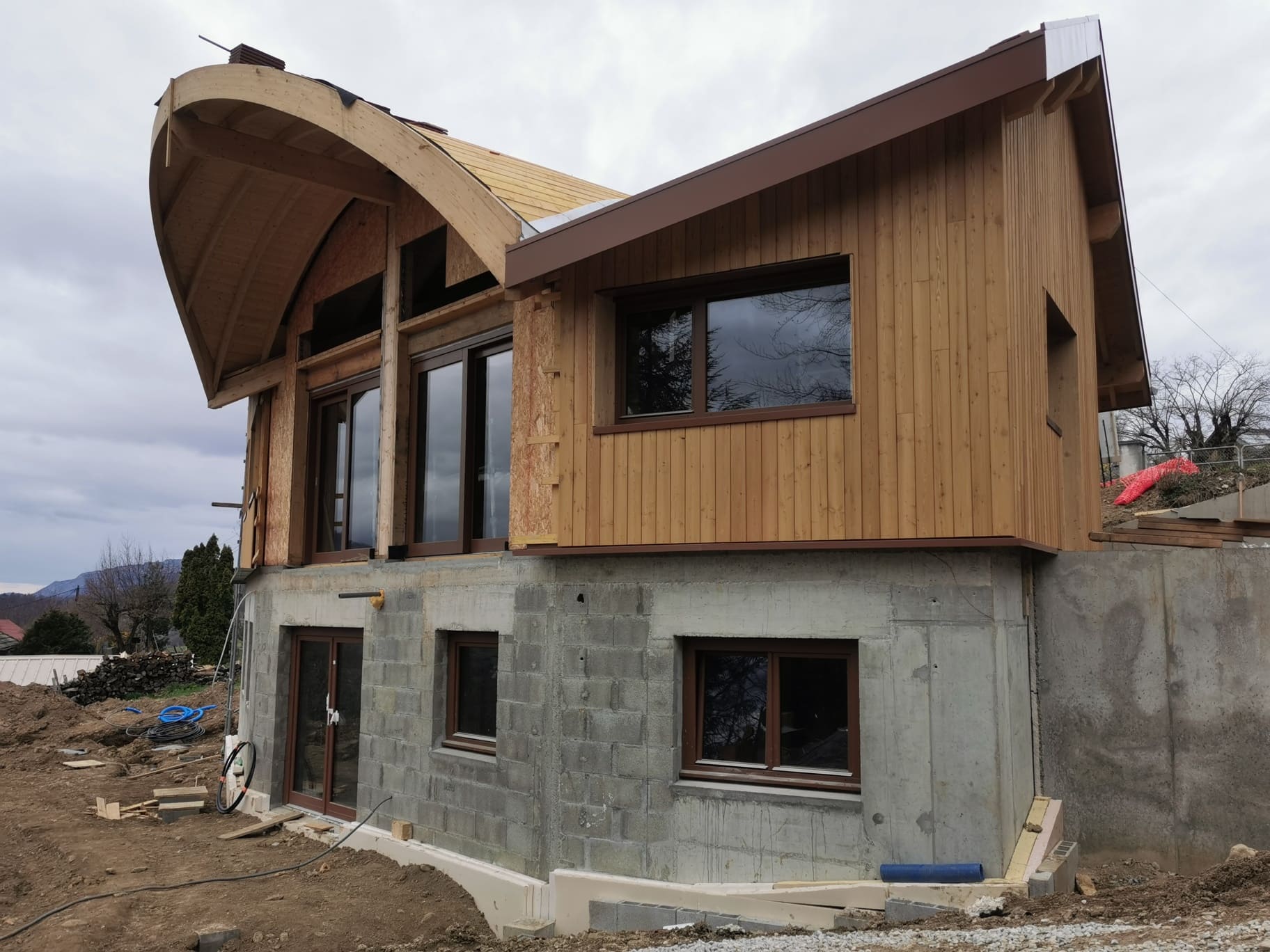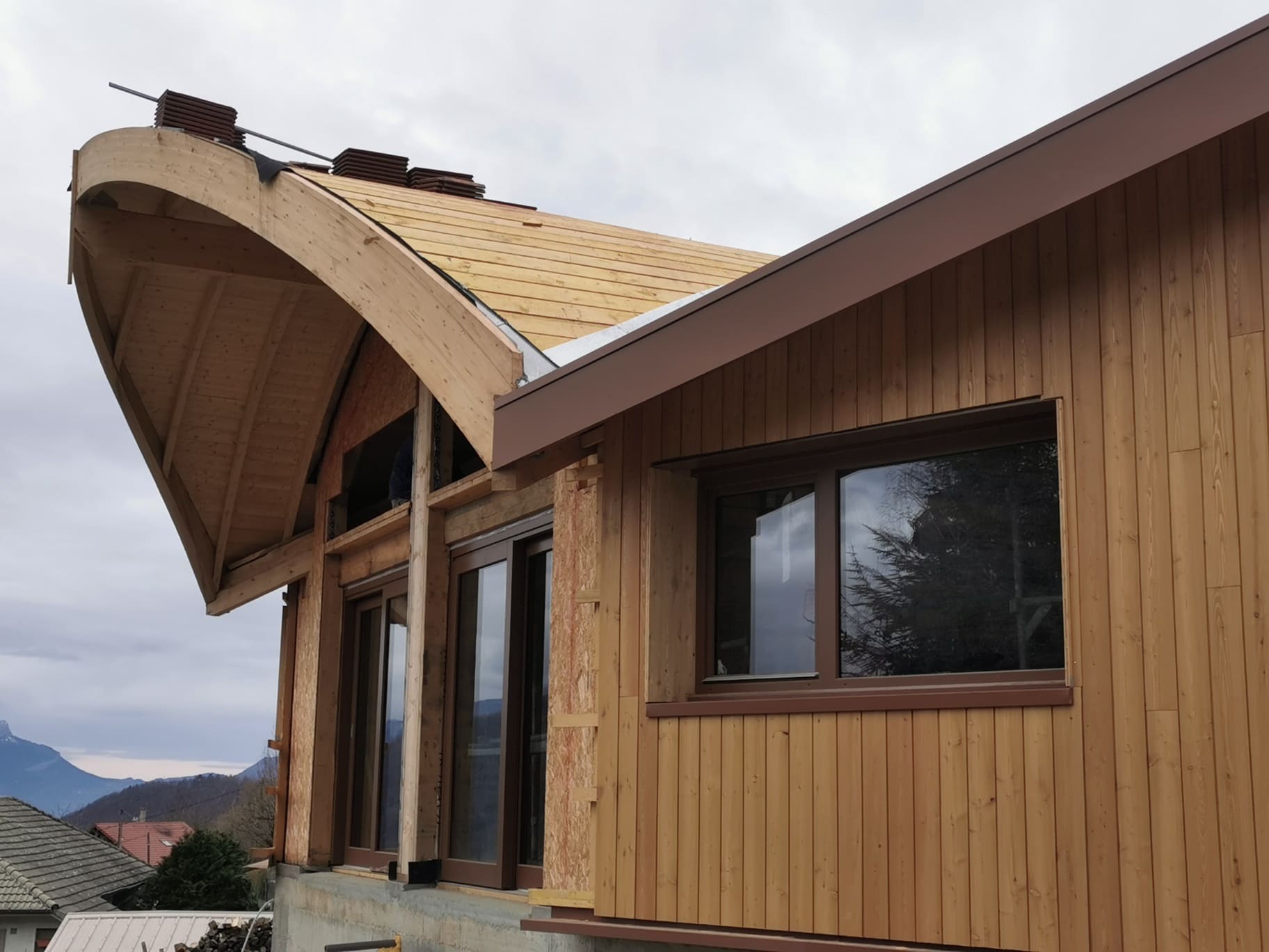 Maison à ossature bois et charpente à double pente coiffée d’une lucarne arrondie supportée par un bandeau porteur à double courbure.
