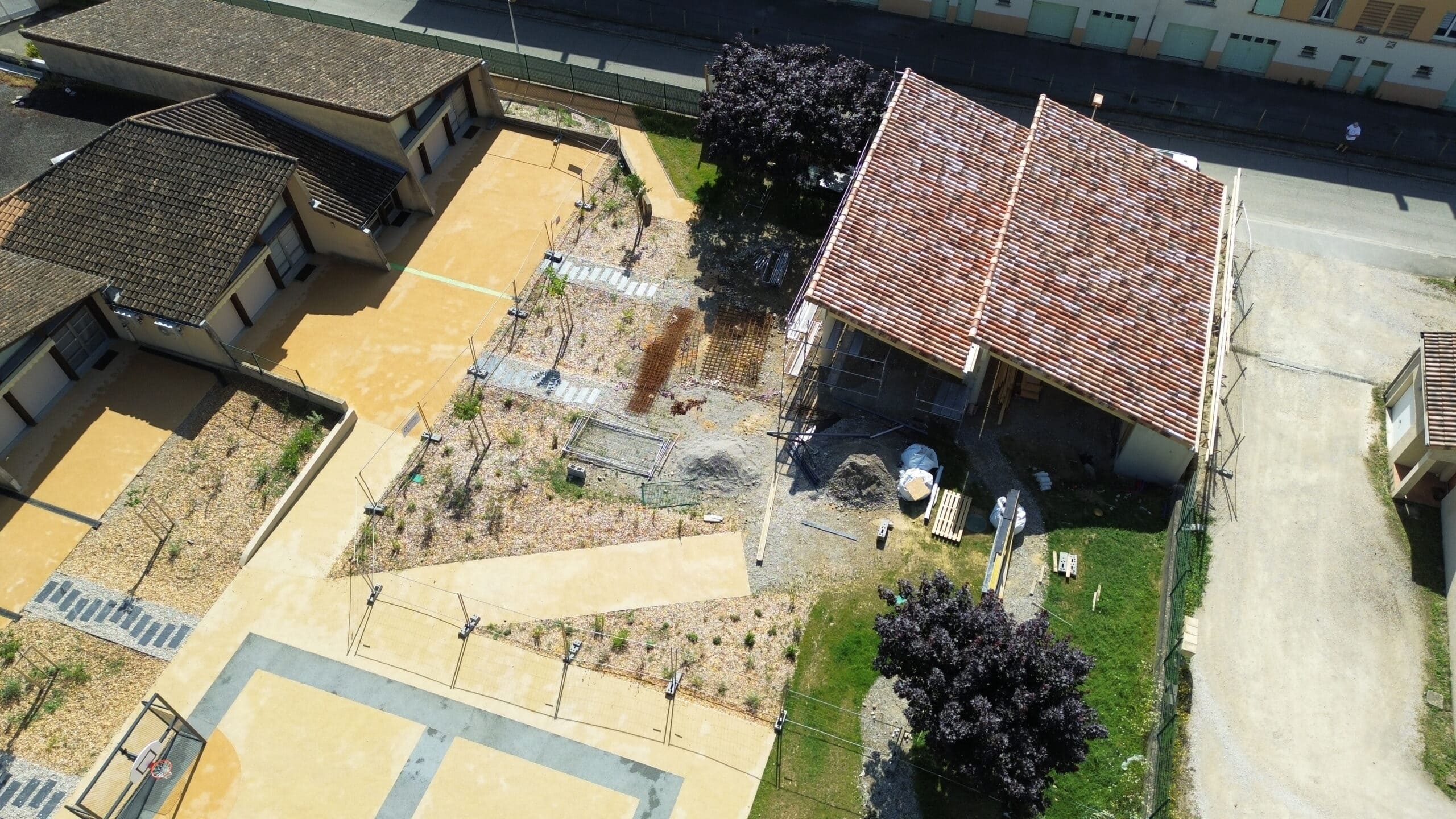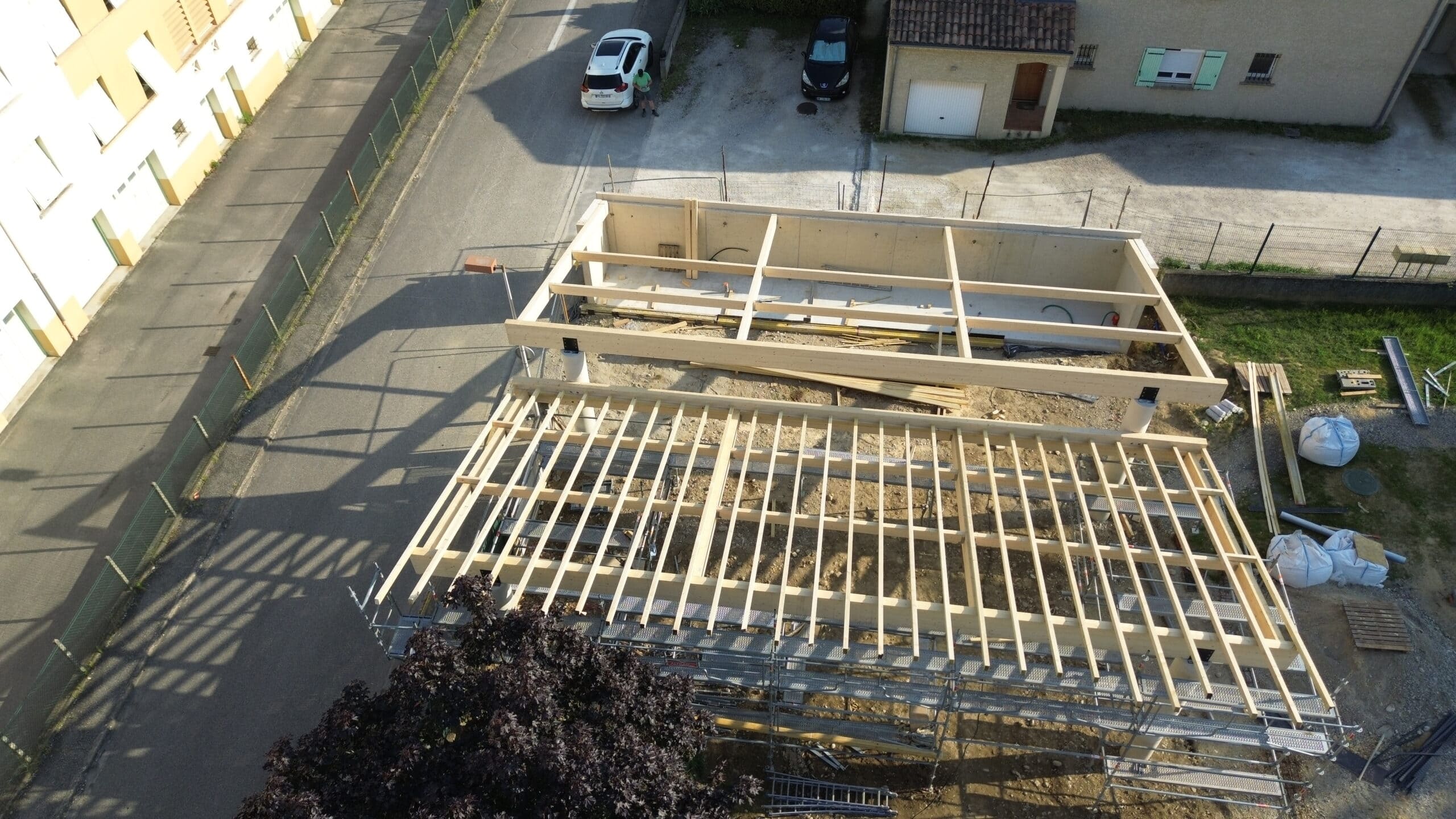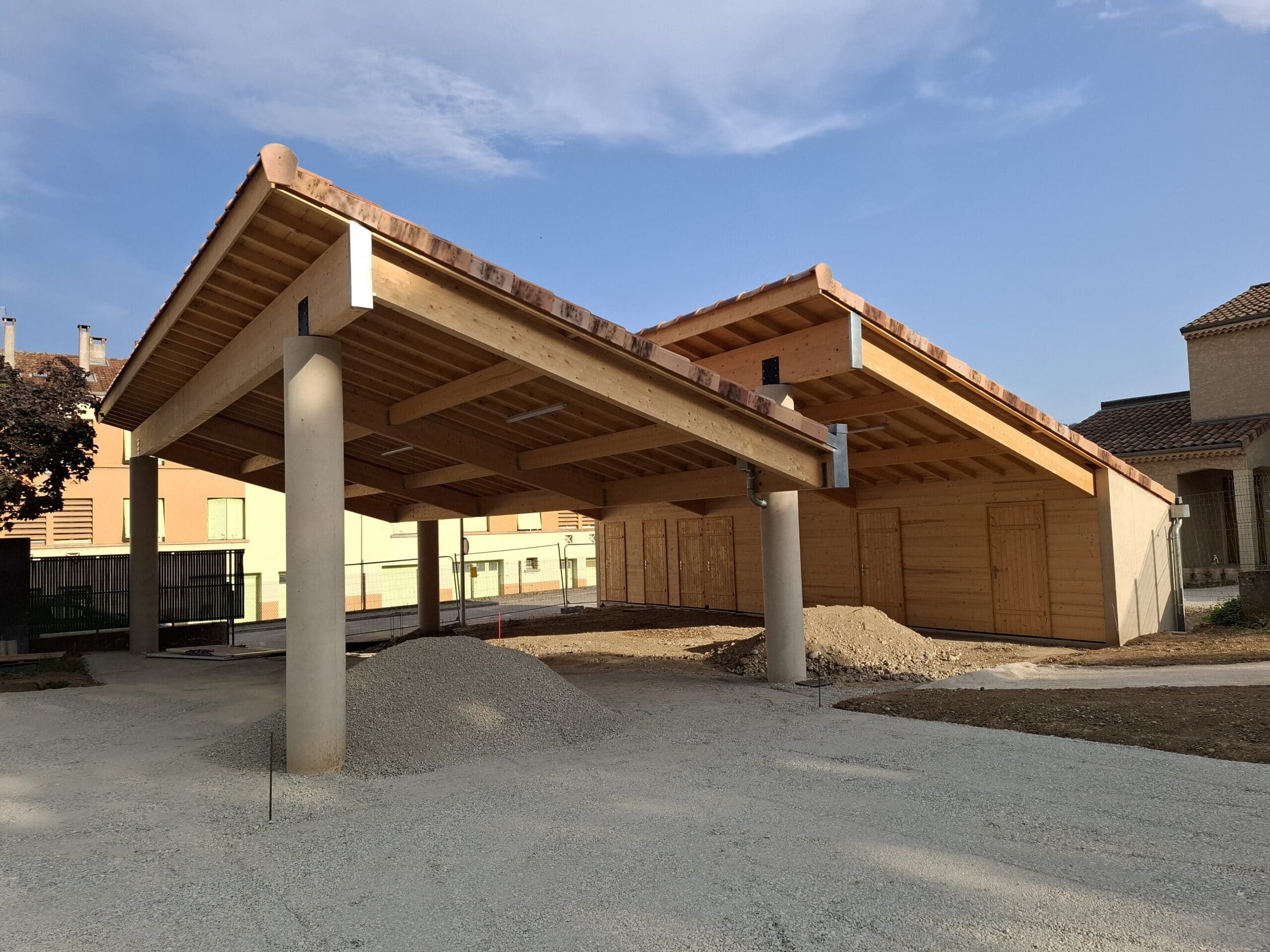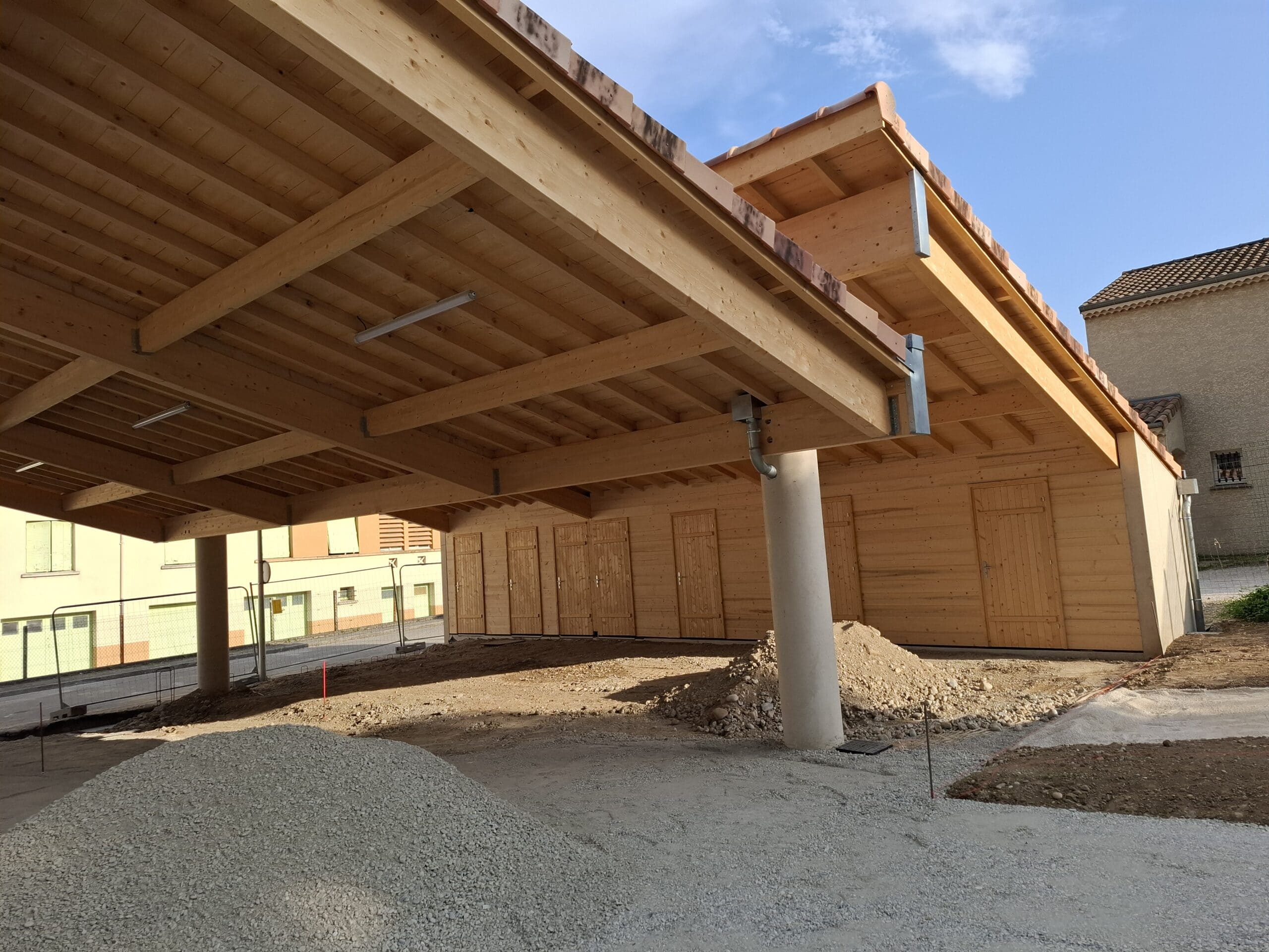 Charpente en bois lamellé collé en forme de shed s’appuyant sur 4 poteaux béton et une ossature bois.