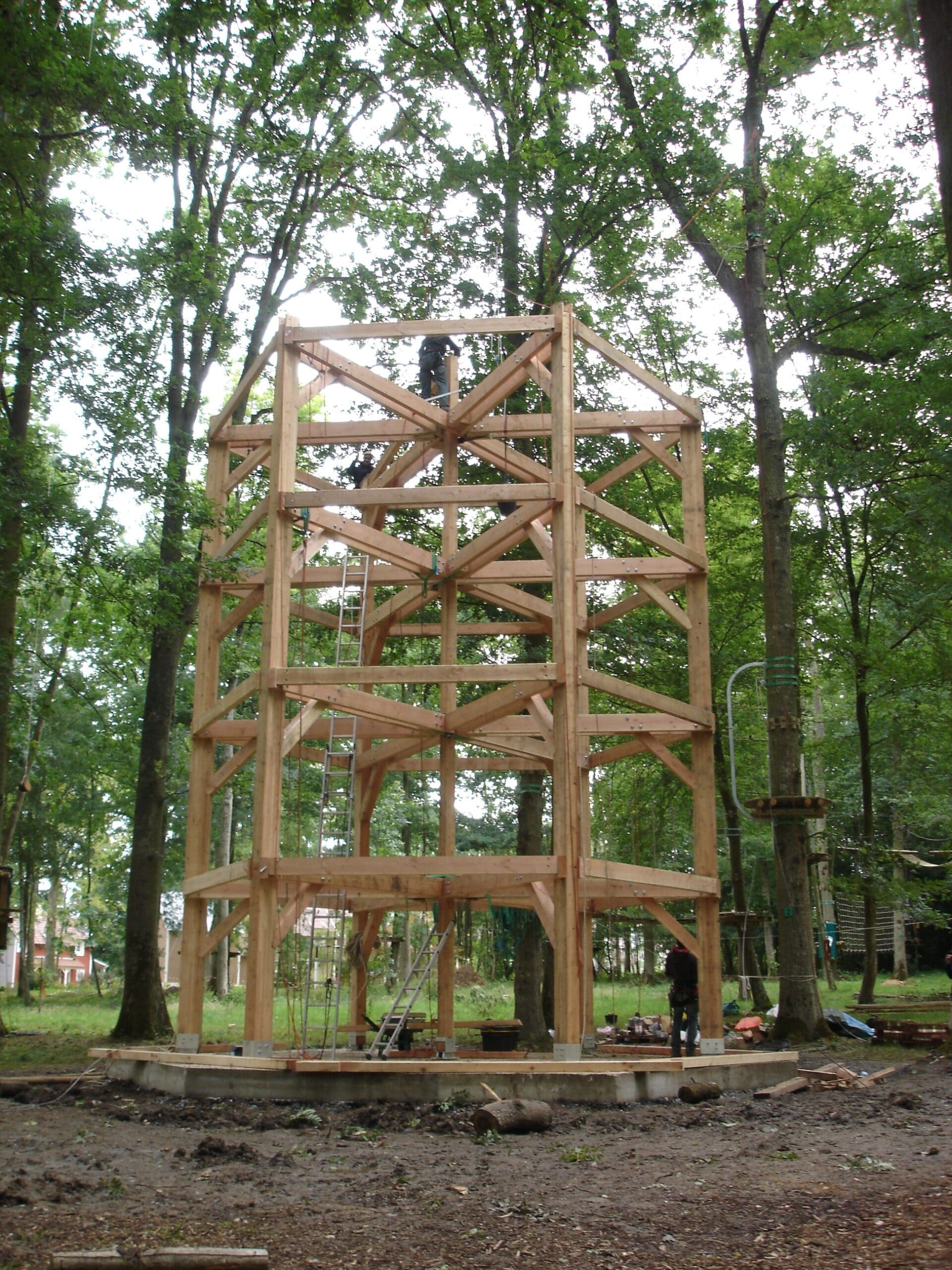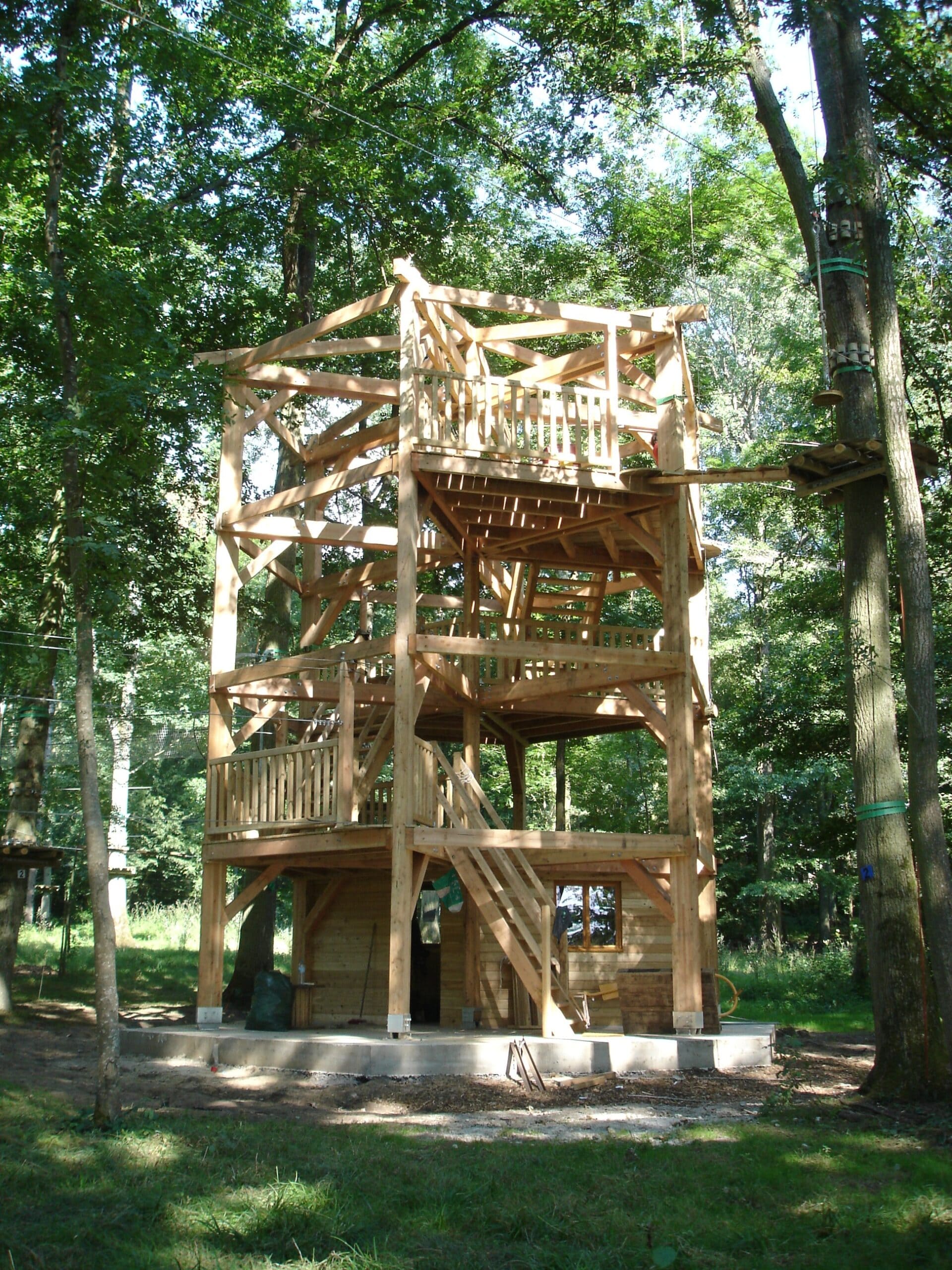 Tourelle en poteaux – poutres en douglas connectés avec des assemblages traditionnels .